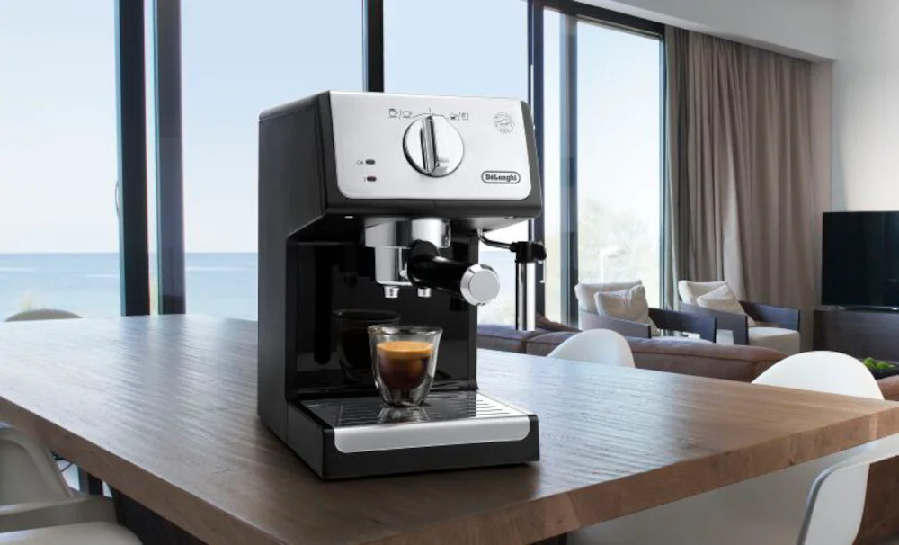 Shiny silver and black DeLonghi ECP31.21.BK Espresso Maker for memorable coffee moments. The compact but efficient coffee machine makes espresso in an instant, and with the milk frother you can easily make creamy cappuccinos and lattes.