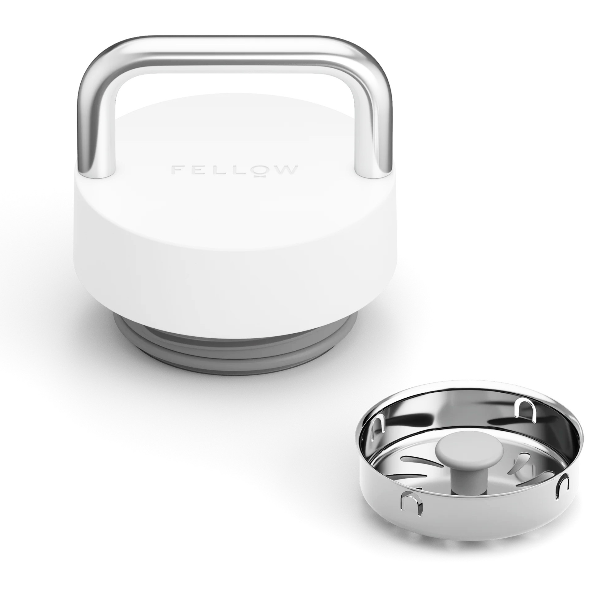 The leak-proof Fellow Carter Carry Lid features a premium metal handle for easy carrying and includes a snap-in splash guard.