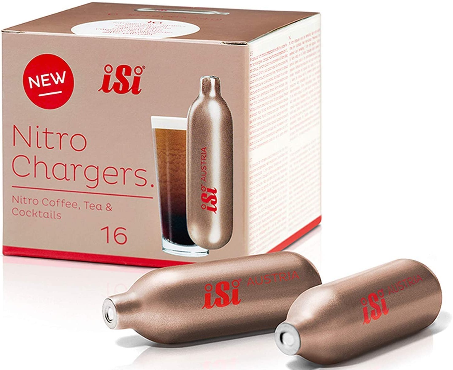 iSi Nitro Coffee Whip Chargers for the iSi Nitro Coffee Whip when preparing nitro coffee. 16 pcs stainless steel chargers, each containing 2,4 g of pure nitrogen.
