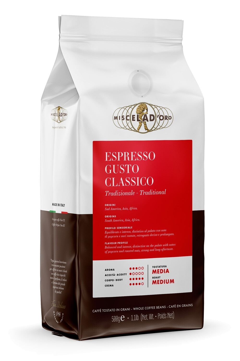Miscela d'Oro Gusto Classico is a traditional Italian espresso blend with strong body, chocolaty taste and a distinctive character. The coffee gives a generous crema and a long, pleasant aftertaste.