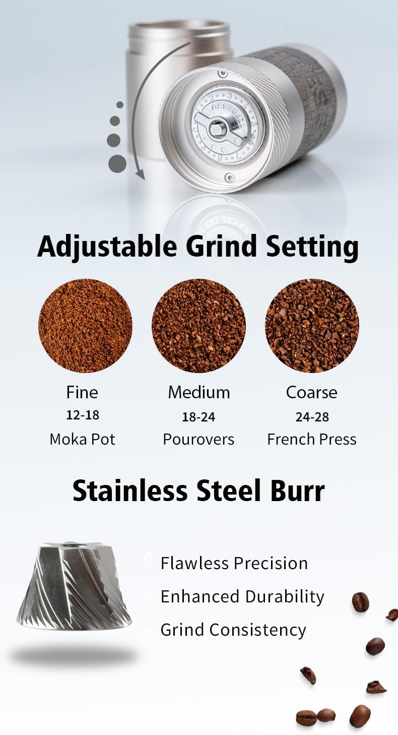 Säätönupissa on 10 numeroa / 30 napsautusta. Q-mylly on ensisijaisesti suunniteltu pour over -kahville, mutta sitä voidaan käyttää myös muihin kahvinvalmistusmenetelmiin.