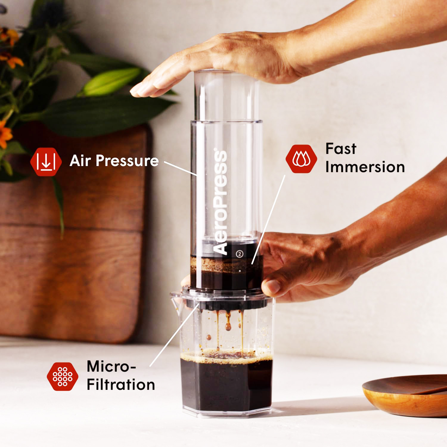 - Sisältö: AeroPress Clear XL -kammio, mäntä, sekoitin, mittalusikka, Micro-filters -paperisuodattimet ja AeroPress-karahvi
