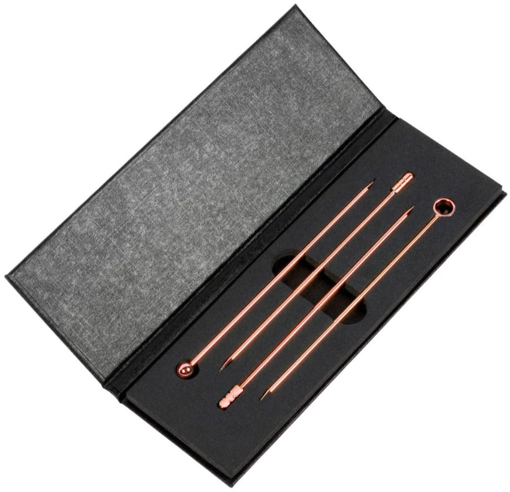 Kuparinvärisessä mallissa tikut on pinnoitettu kuparilla komean kiiltävän lopputuloksen saavuttamiseksi. Metalliset juomatikut nostavat cocktailin tarjoilun ylellisemmälle tasolle. Täydellinen lahja drinkkiharrastajalle; tyylikäs laatikko antaa ylellisen vaikutelman.