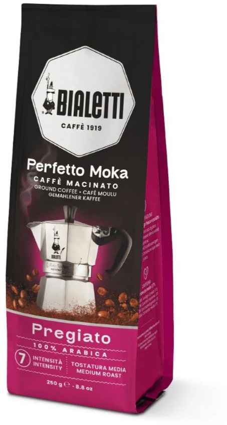 Bialetti Perfetto Moka Pregiato on italialainen keskipaahtoinen espressokahvi. 100 % Arabica-kahvia Brasiliasta, herkkä maku, jossa selkeitä hasselpähkinän ja kuivattujen hedelmien vivahteita.