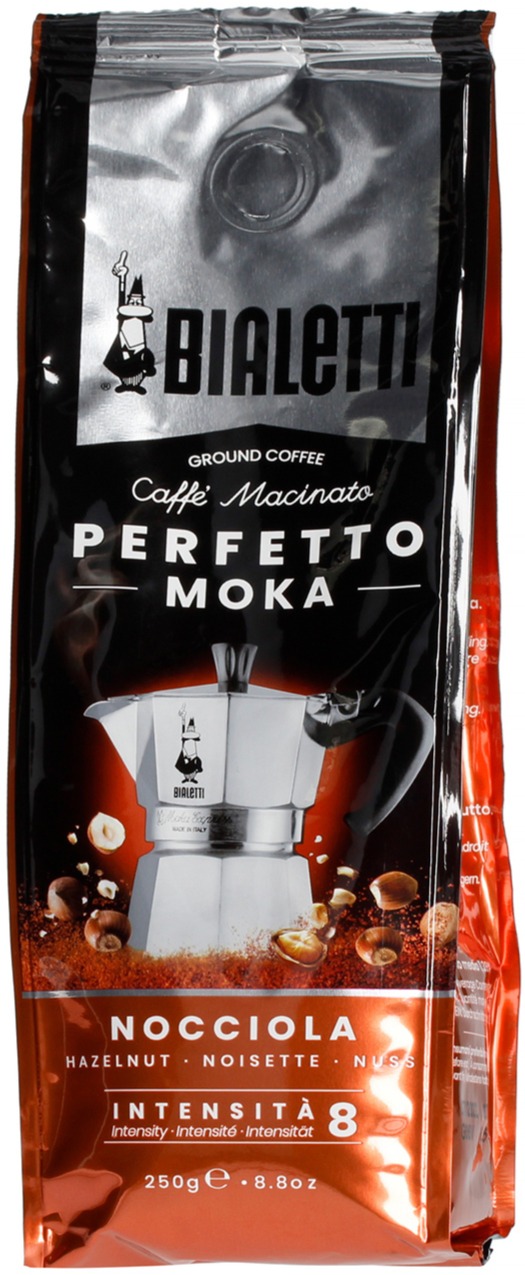Bialetti Perfetto Moka Nocciola on maustettu gourmet-kahvi, jonka hasselpähkinäisessä maussa on paahdettuja vivahteita ja pyöreä, herkkä maku. Kahvisekoitus koostuu 50 % kolumbialaisesta Arabicasta ja 50 % Robustasta, hasselpähkinäaromista ja -uutteesta. Täyteläinen, intensiivinen ja makea makumaailmai, jossa korostuvat hasselpähkinäset vivahteet.
