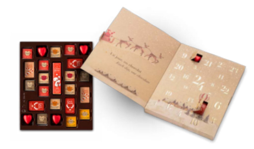 Laske päiviä jouluun tällä belgialaisella suklaakalenterilla! Jokaisen 24 luukun takaa paljastuu herkullinen yllätys Café-Tasselta – sekoitus mini-suklaita, neapolitanoja, pralineja ja jouluaattona erityisen herkullinen yllätys.
