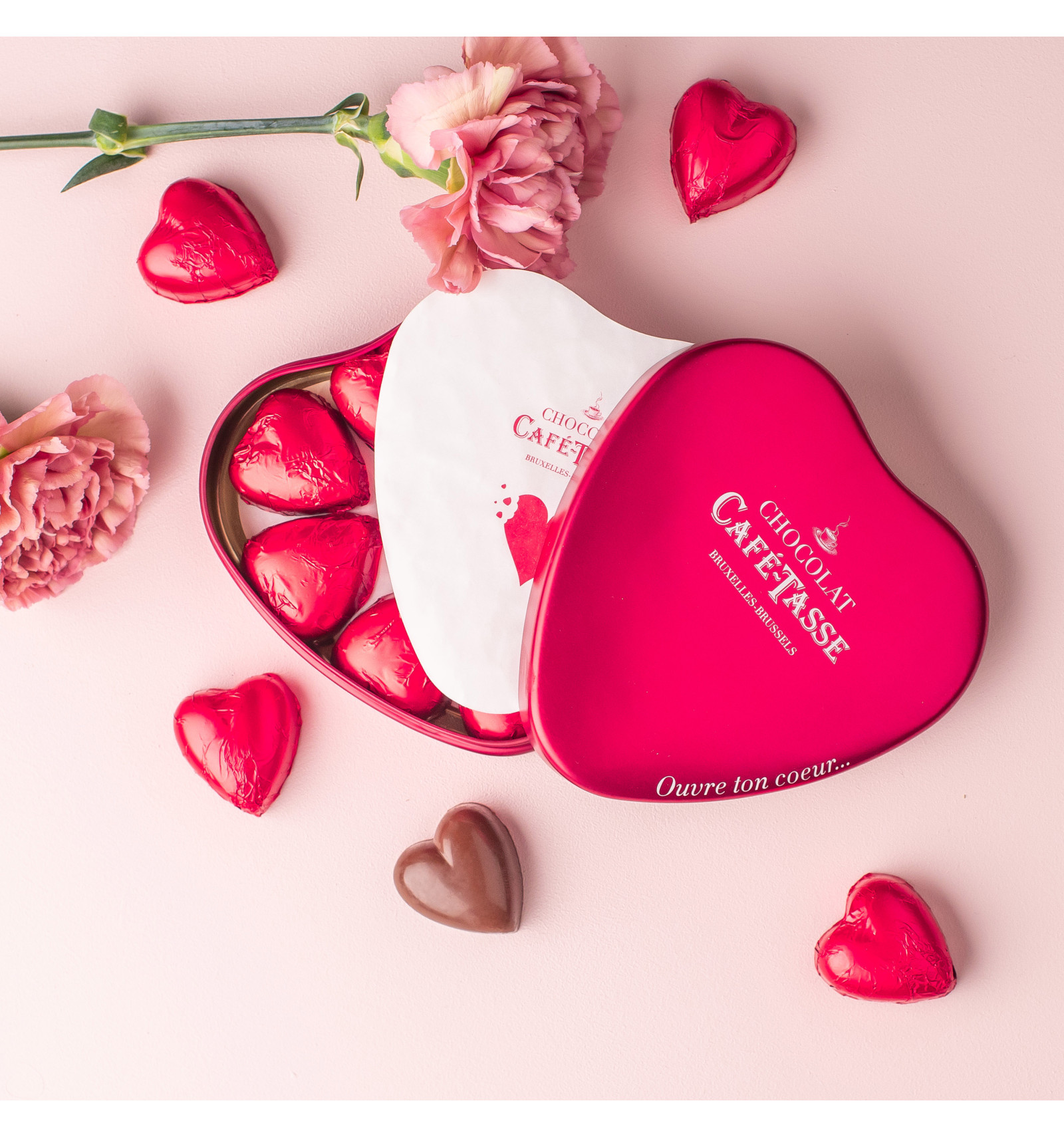 Kaunis sydämenmuotoinen metallirasia, jossa on kaiverrus “Ouvre ton cœur”, sisältää 9 sydämenmuotoista maitosuklaakonvehtia (38% kaakaota) täytettynä hasselpähkinäpraliinilla. Samettinen praliini ja pähkinäinen rapsakkuus tekevät tästä käsintehdystä suklaasta todellisen herkun.
