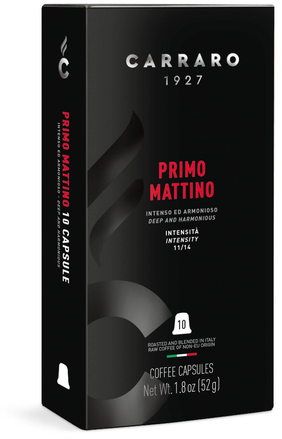 Carraro 1927 Primo Mattino Nespresso-yhteensopivat kapselit sisältävät kahvisekoituksen, jossa on suurempi osuus Robusta-papuja. Tämä antaa kahville täyteläisen, vahvan rungon. Jalostettuja, yksilöllisesti paahdettuja Arabica-lajikkeita on lisätty tuomaan esiin tämän vahvan espressokahvin kermaisuuden ja pyöreän maun.