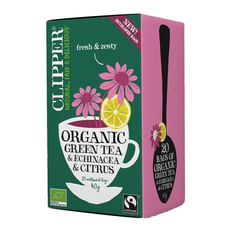 Kevyt ja virkistävä vihreä teesekoitus Clipper Organic Green Tea & Ecinacea & Citrus, josta löytyy Echinaceaa (punahattu) sekä sitruunan, appelsiinin ja limen raikkautta. Vihreä tee viljellään Reilun kaupan luomutiloilla Intiassa ja Kiinassa. Tee on sekoitettu ja pakattu Clipperin teetehtaalla Etelä-Englannissa.