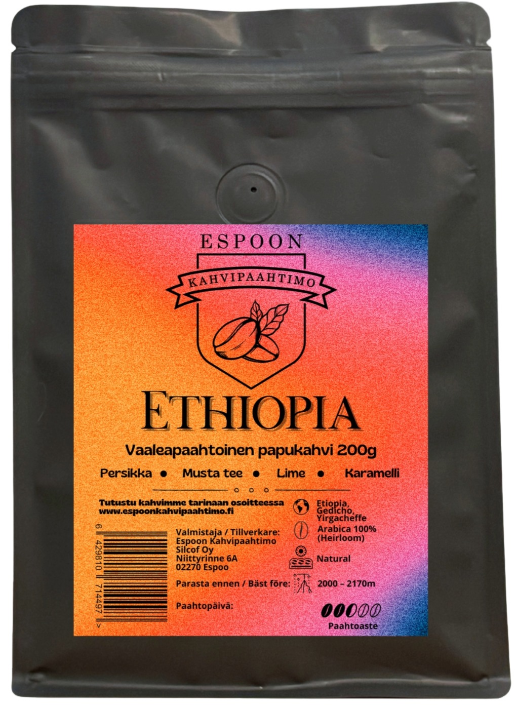 Espoon Kahvipaahtimo Ethiopia hurmaa kirkkailla ja raikkailla makuvivahteillaan. Kupista löytyy persikan ja limen hedelmäistä raikkautta, jota mustan teen vivahteet ja hienovarainen karamellisuus täydentävät. Lopputulos on elegantti ja hienostunut kahvielämys, joka sopii erityisesti laadukkaan, vaaleamman paahtoasteen ystäville.