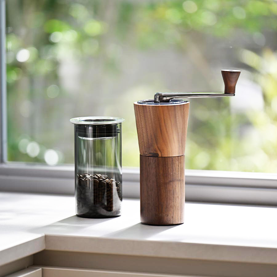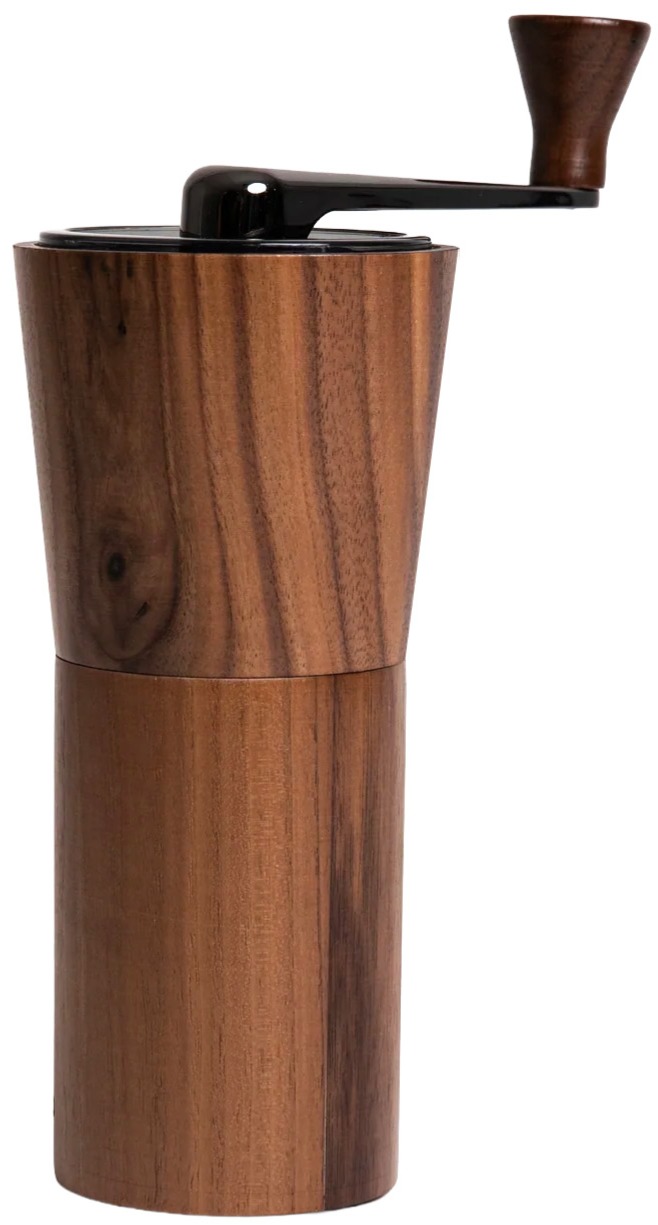 Hario Walnut Wood pähkinäpuinen kahvimylly on muodoltaan korkea ja tyylikäs, ja siinä on tummat, yhteensopivat pähkinäpuiset säiliöt, kun taas valettu alumiinikahva tarjoaa sekä voimaa että tyylikkään viimeistelyn.