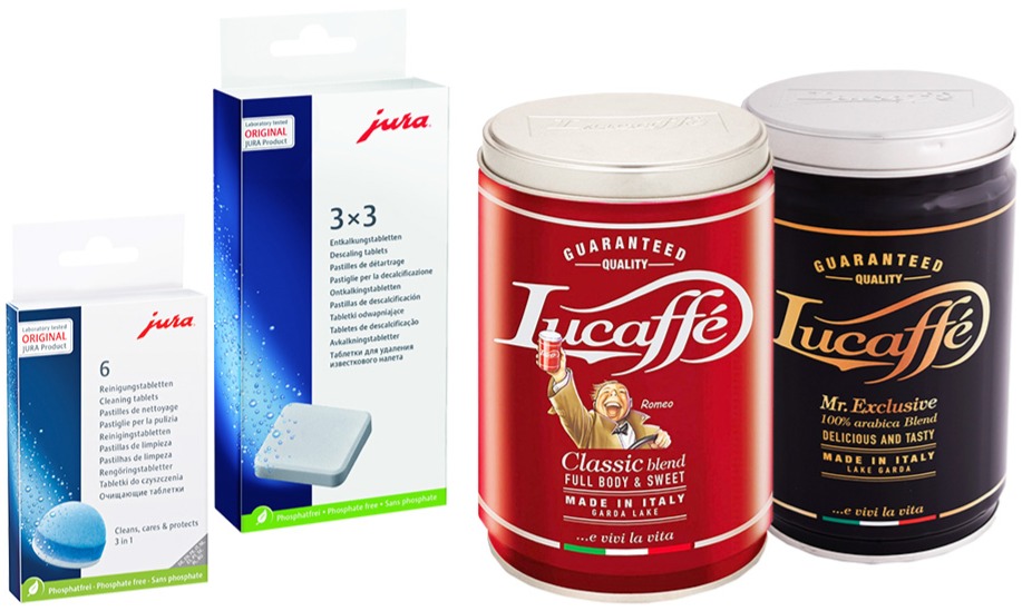 Jura puhdistustabletit 6 kpl + kalkinpoistotabletit 3 x 3 + Lucaffé Classic 250 g + Lucaffé Mr. Exclusive 250 g