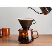 Todella kaunis meripihkanvärinen kahvikannu. Se on helppo käsitellä ja kaataa kahvia mukiin läikyttämättä nestettä. Käytän Clever Dripperiä kahvin valmistamiseen ja se sopii täydellisesti kannun aukkoon.
