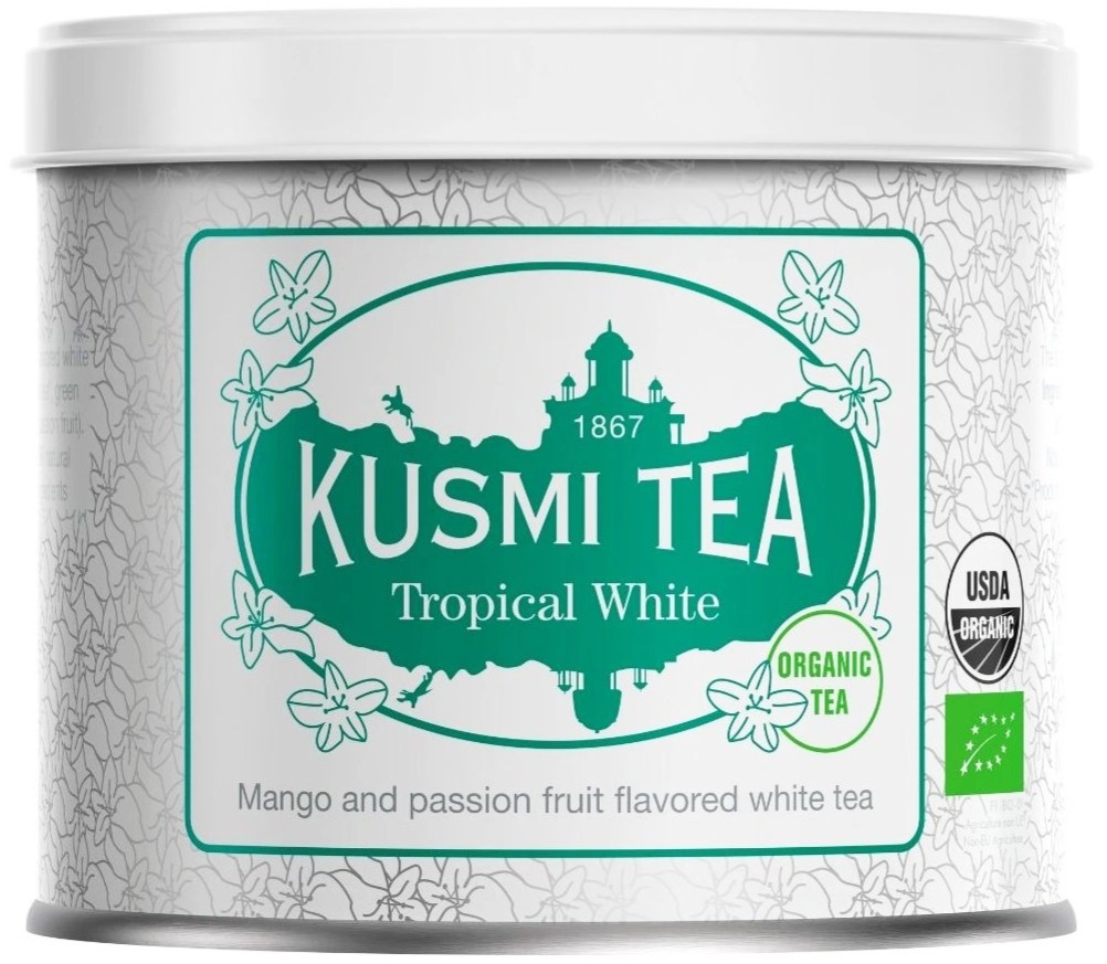 Kusmi Organic Tropical White Tea on luomulaatuinen valkoinen tee, jossa on trooppisen hedelmäinen vivahde. Sen kevyt ja raikas maku tuo esiin pehmeitä hedelmäisiä vivahteita ja miellyttävän, luonnollisen makean jälkimaun.