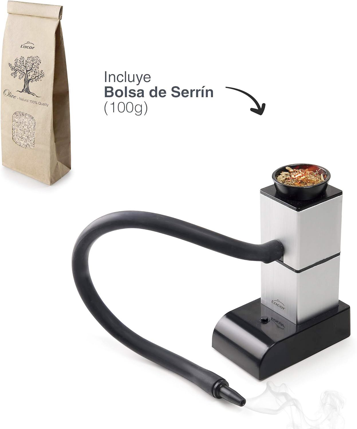Pakkauksessa on savustimen lisäksi 2 kpl varasihtejä, joita voi puhdistaa esim. liottamalla ne asetonissa. (Varasihtejä on saatavana myös erikseen varaosina). Mukana on myös 100 g pussillinen oliivipuun puruja, jotka sopivat monenlaiseen savustamiseen mm. lampaanliha, siipikarja ja kala.
