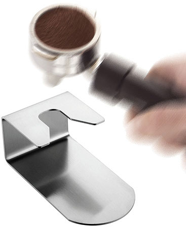 Teräksinen tamppausteline johon voit tukea suodatinkahvan tamppausta varten. Telineen pohjassa on kuminen matto joka estää telineen liukumisen pöytäpinnalla tamppauksen aikana.
