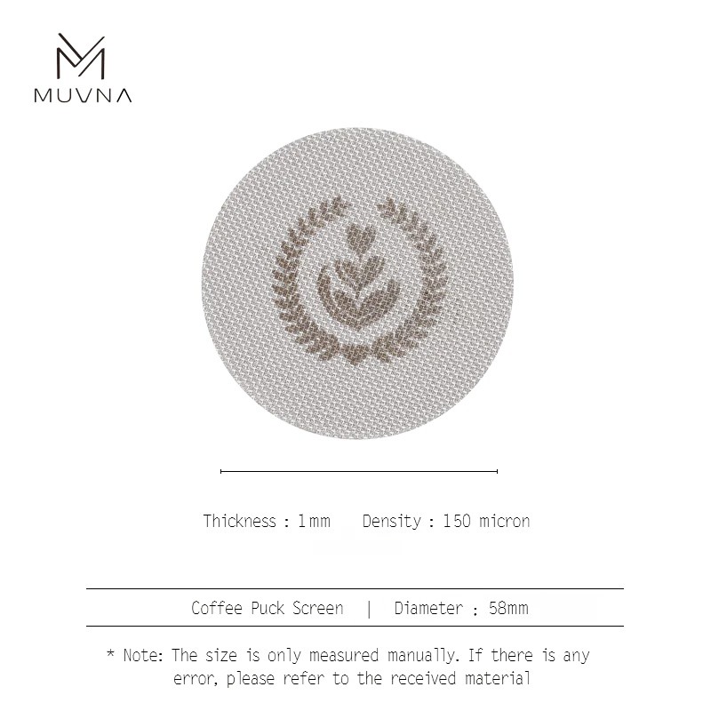 MUVNA Puck Screen -suodatin on valmistettu erittäin ohuesta (1 mm) ruostumattomasta teräksestä ja sopii 58 mm suodatinkahvaan. Se edistää tasaisen veden jakautumista ja näin yhdenmukaisempaa kahvin uuttoa.