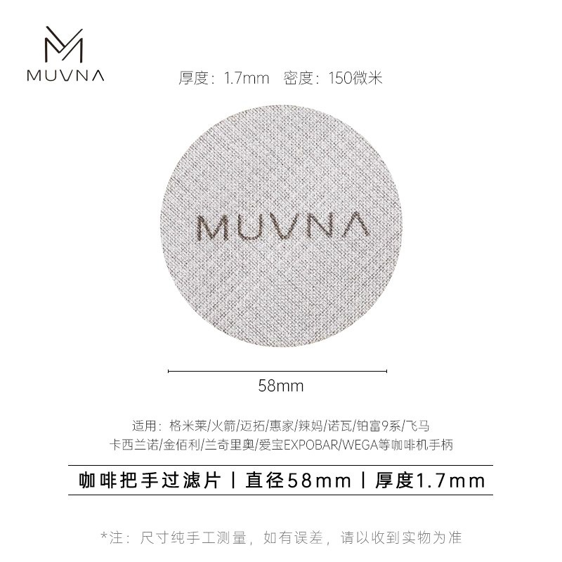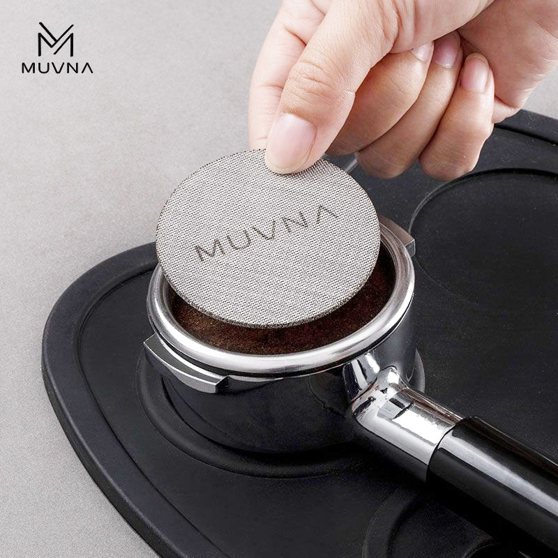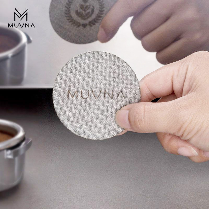 MUVNA Puck Screen -suodatin on valmistettu 1,7 mm ruostumattomasta teräksestä ja sopii 58 mm suodatinkahvaan. Se edistää tasaisen veden jakautumista ja näin yhdenmukaisempaa kahvin uuttoa.