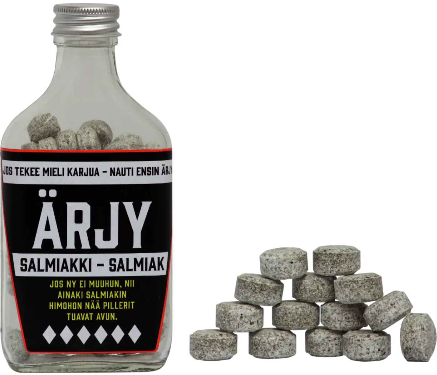 Ärjy – salmiakkinen puristepastilli pakattuna hauskaan taskumattiin. Kunnolla salmiakkinen pastilli.
