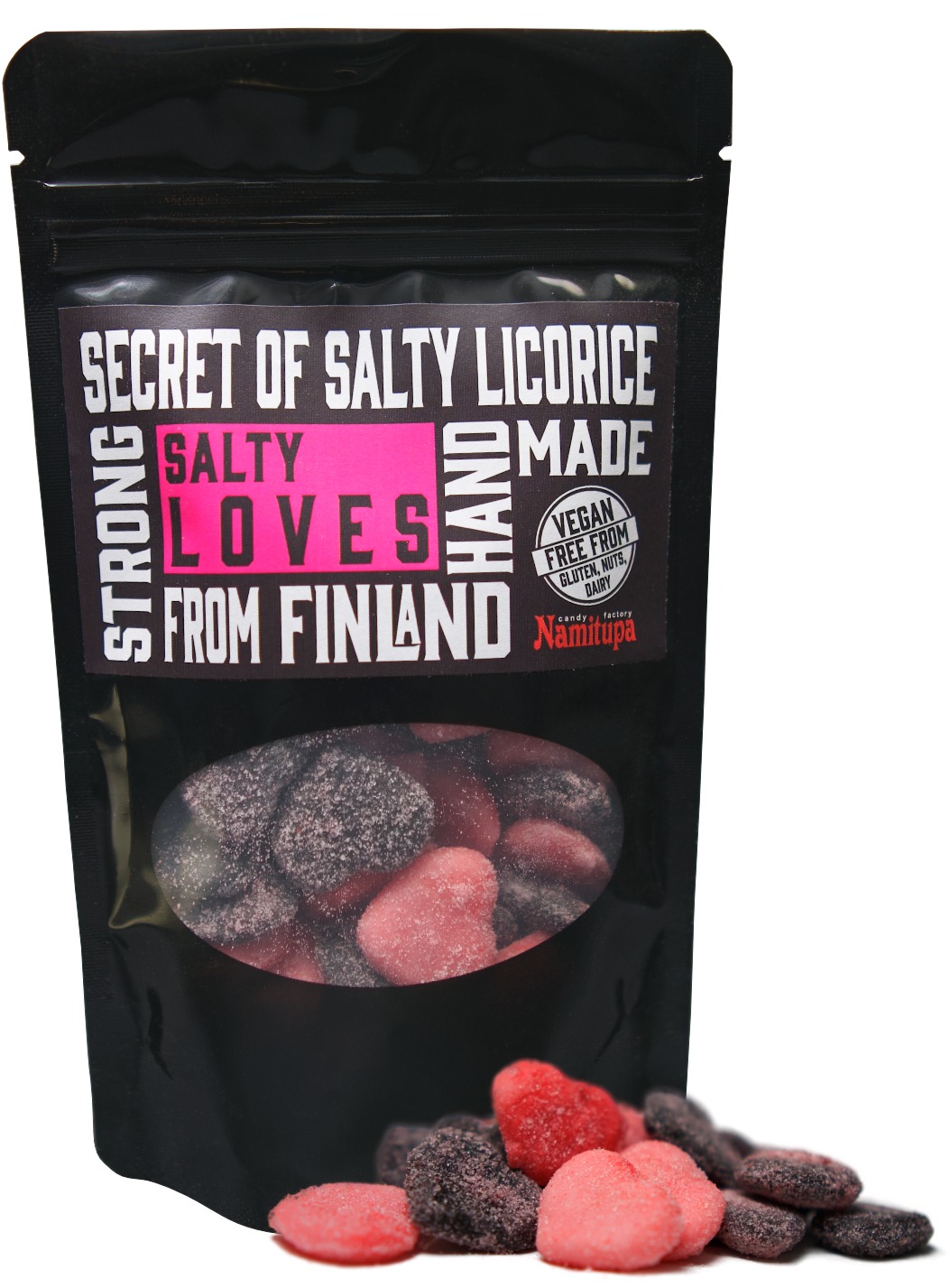 Salty Loves, Rakkaussalmiakki, Salta Kärlekar. Rakkaalla salmiakilla on monta nimeä. Supersuosittu Salmiakki Finlandiallakin palkittu maultaan todella suolainen salmiakki vadelmaraidoin. Maista ja ihastu!
