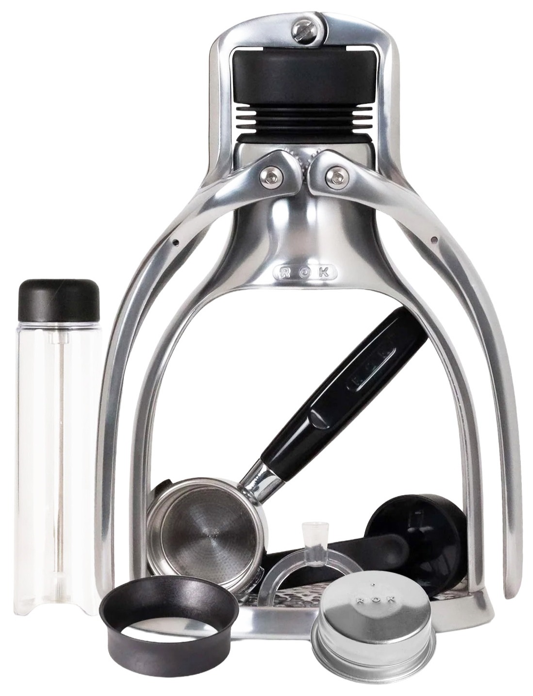 Käsikäyttöinen ROK EspressoGC PLUS-espressokeitin on valmistettu valetusta alumiinista, teräksestä ja lasikomposiitista.
