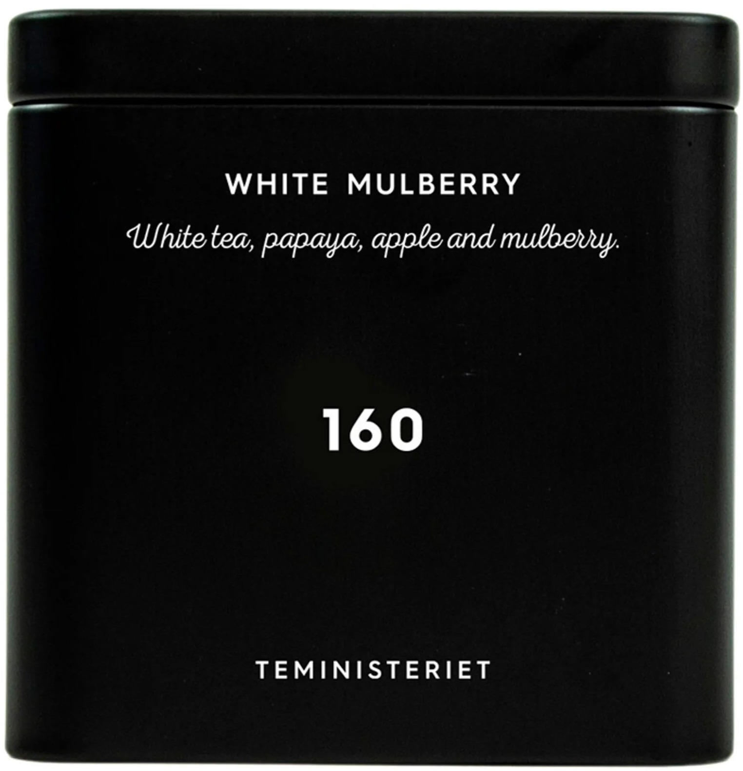 Teministeriet 160 White Tea Mulberry on maukas ja virkistävä valkoinen tee, joka on sekoitettu makeiden mulperimarjojen, rapean omenan ja papaijan kanssa. Kehäkukan, jasmiinin ja ruiskaunokin terälehdet tuovat miedon tuoksun ja kauniin värin.