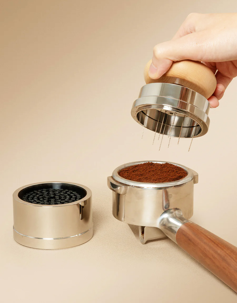 Kahdeksalla erittäin ohuella 0,3 mm neulalla varustettu työkalu jakaa kahvijauheen tasaisesti ennen tampperin käyttöä. Magneettinen pohja pitää työkalun tukevasti paikallaan, kun sitä ei käytetä.
