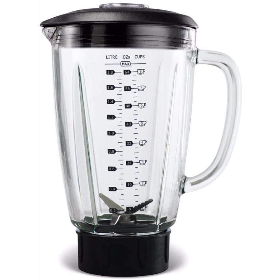 Sisältää kuvan mukaisesti lasikannun, kannen sekä teräyksikön.