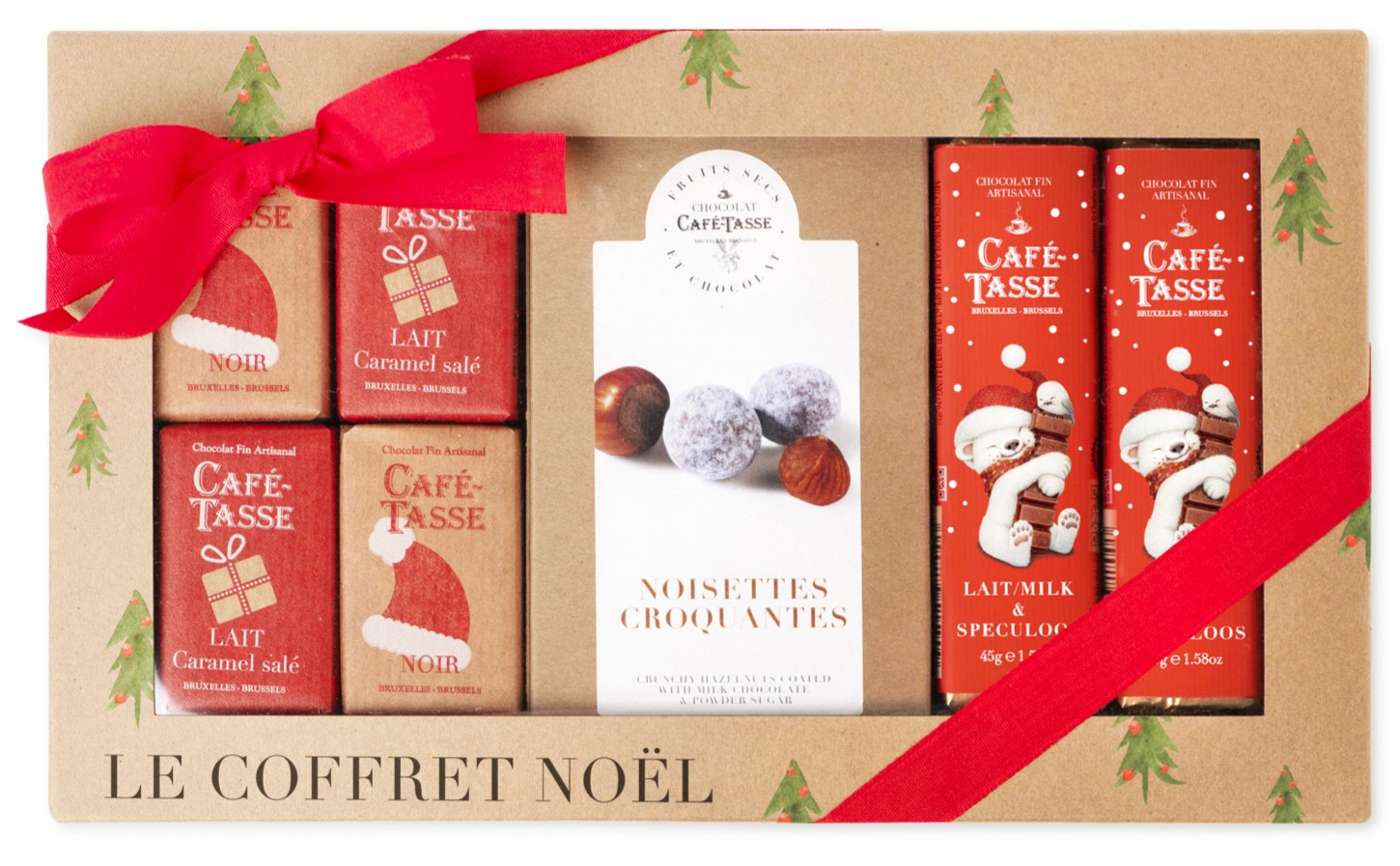 Fira säsongen med denna festliga presentbox från Café-Tasse, perfekt för chokladälskare. Inuti hittar du ett urval av underbara godsaker: