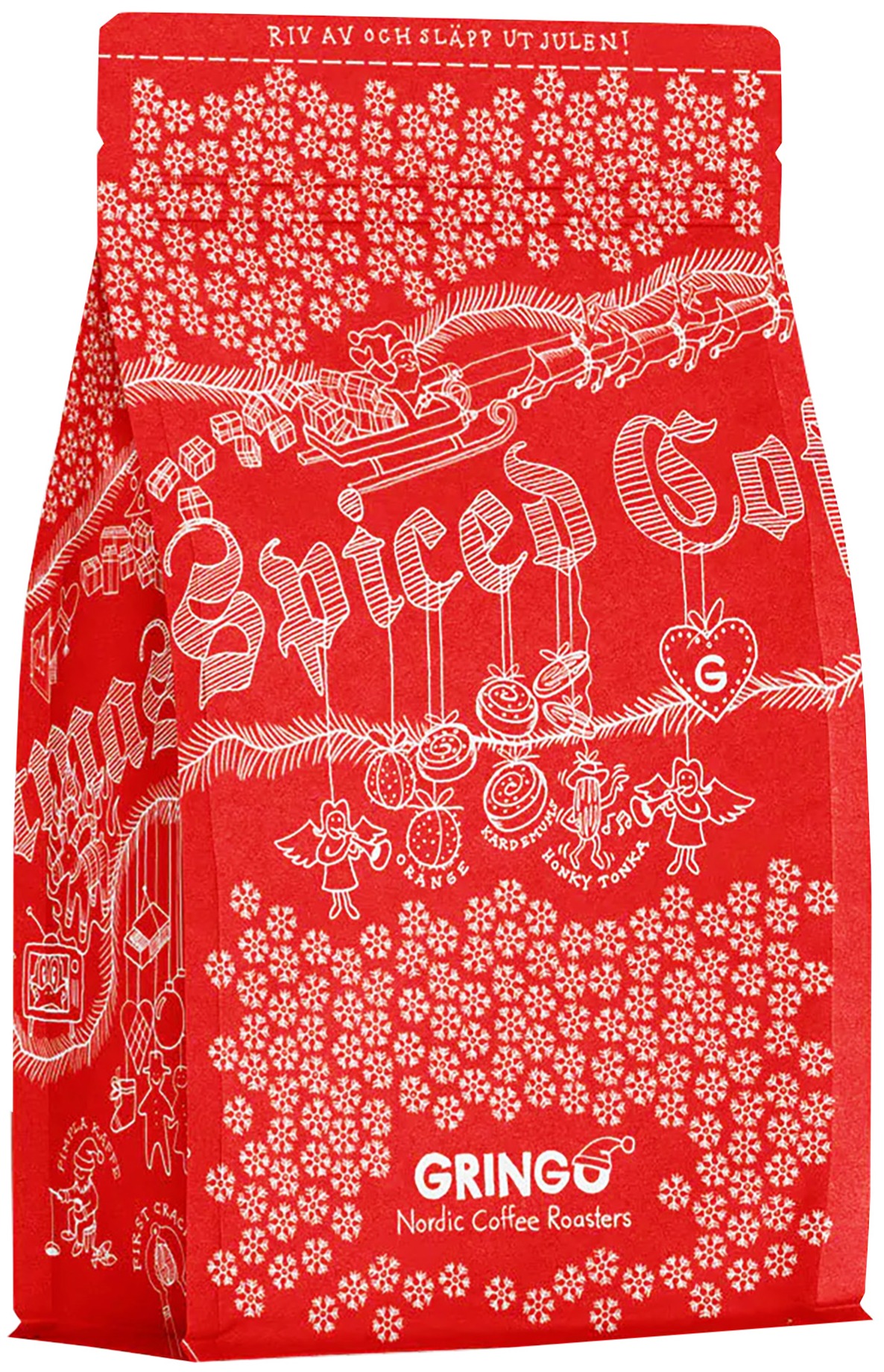 Gringo Christmas Spiced Coffee är en julkryddad och väl vald kaffeblandning med smakrika kaffebönor. Julkaffet är kryddat med ljuvlig nymalen kardemumma, söta apelsinskal samt aromatisk tonkaböna som påminner om marsipan i doft och smak.