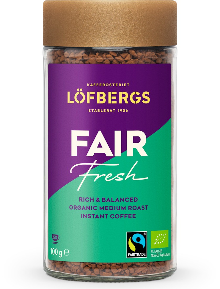 Löfbergs Fair Fresh – balanserat ekologiskt snabbkaffe av 100 % Arabica, rättvisemärkt och hållbart producerat.